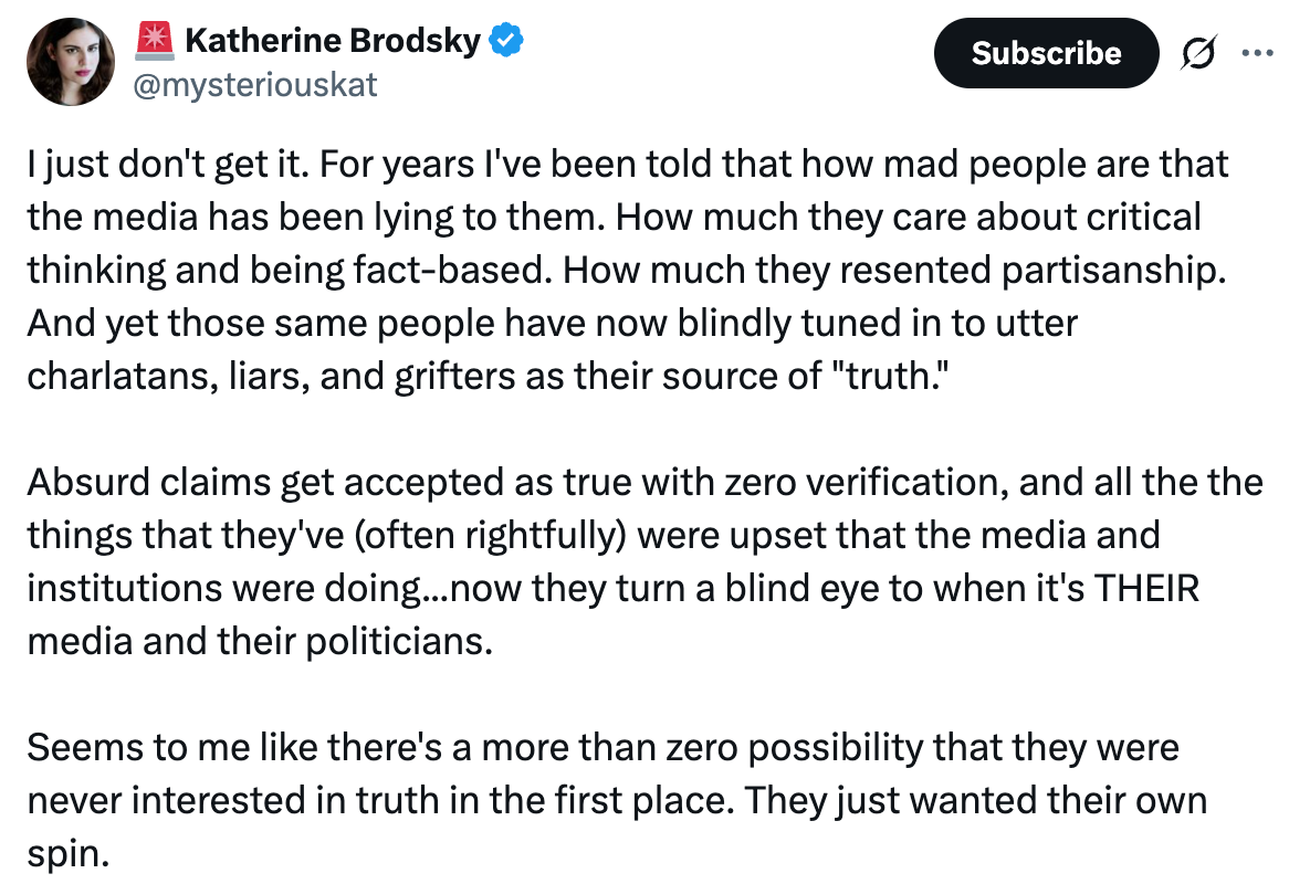 Don’t know what you’re on about saying “The right is not demonstrating any aversion to real truth” when the entire policy of the trumpist regime is “alt facts,” lies as strategy (“I actually won in 2020” & “they’re eating the dogs”), and “blame it on the other guy”? Slight nod, also, to strange religious tenets (virgin birth, resurrection from the dead, etc). Well I don’t expect someone with a profile pic of a guy picking his nose to argue reasonably & respectfully so 🤷♀️