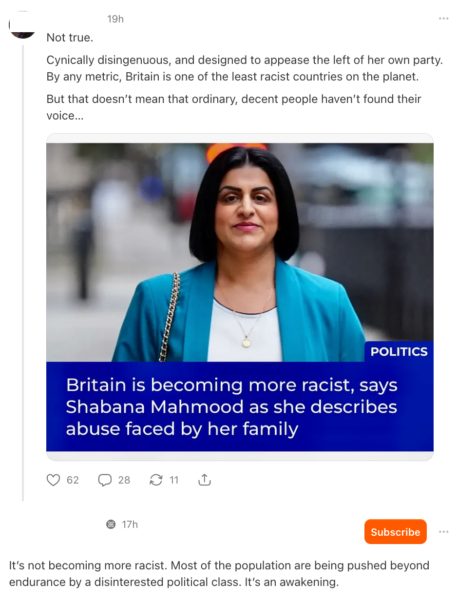 I have recently been seeing a phenomenon in which Brits, usually on the right, respond to a claim that racism is increasing by indignantly refuting this while also appearing to acknowledge that the statement is pointing at something real, but also that the phenomenon is justifiable. It looks like this: