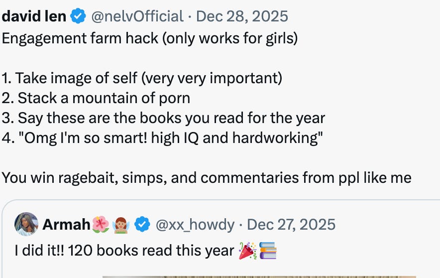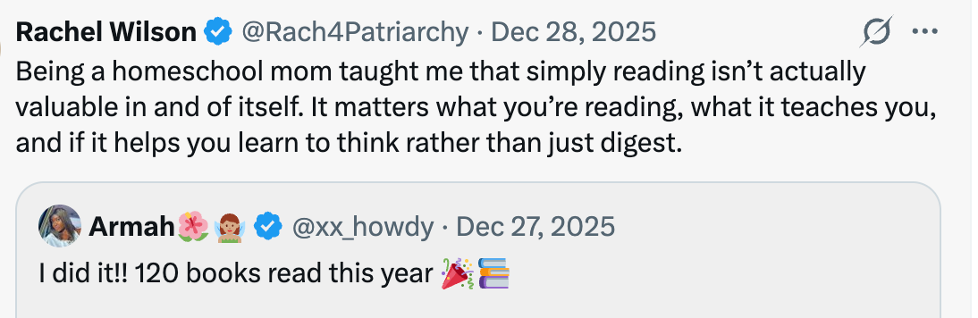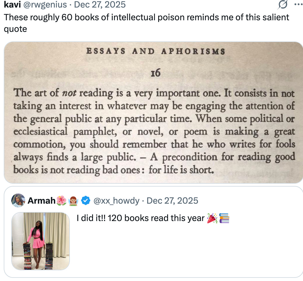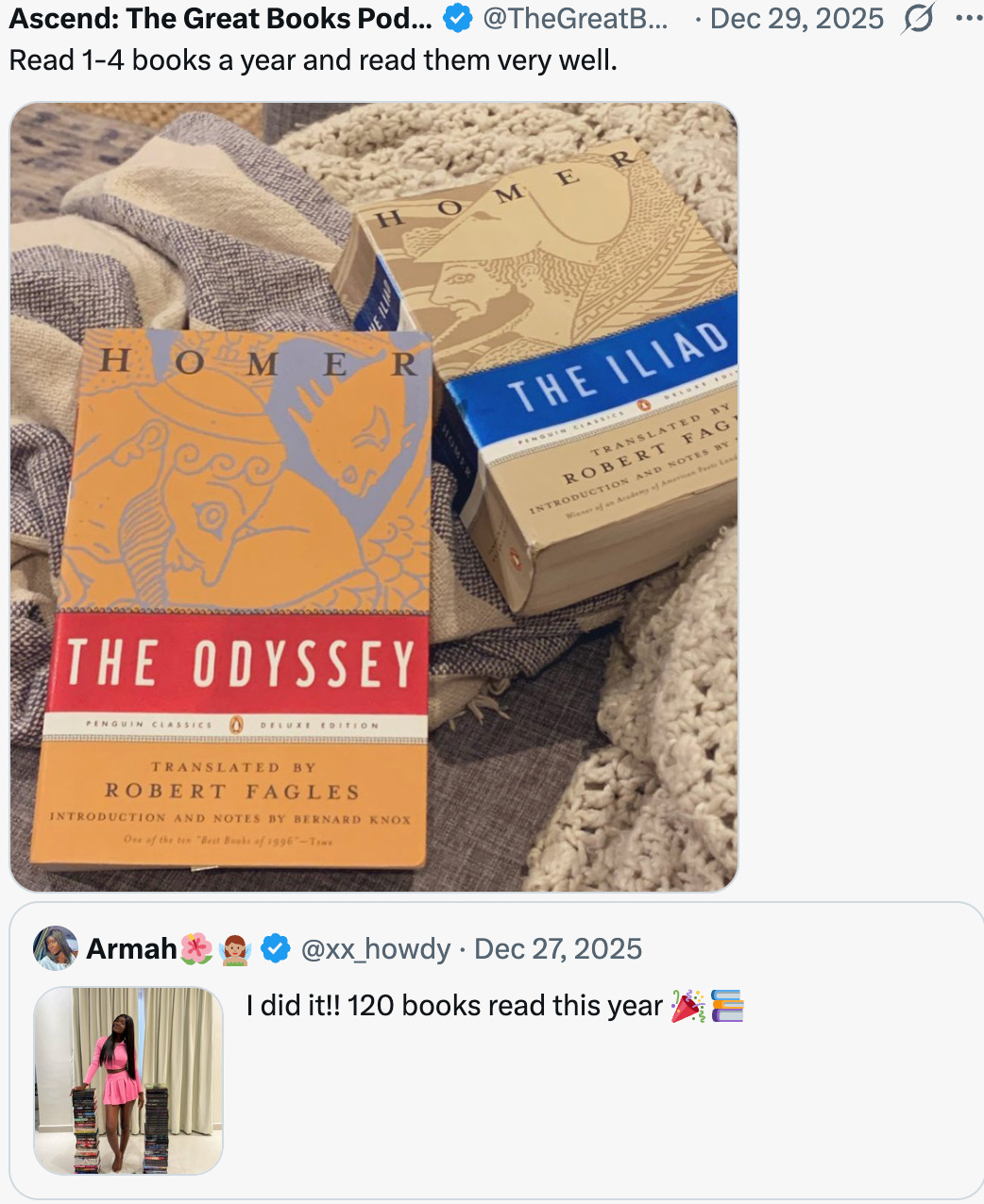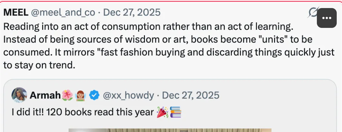 This attitude was exemplified at the end of last year when this young woman posted that she had read 120 books last year.