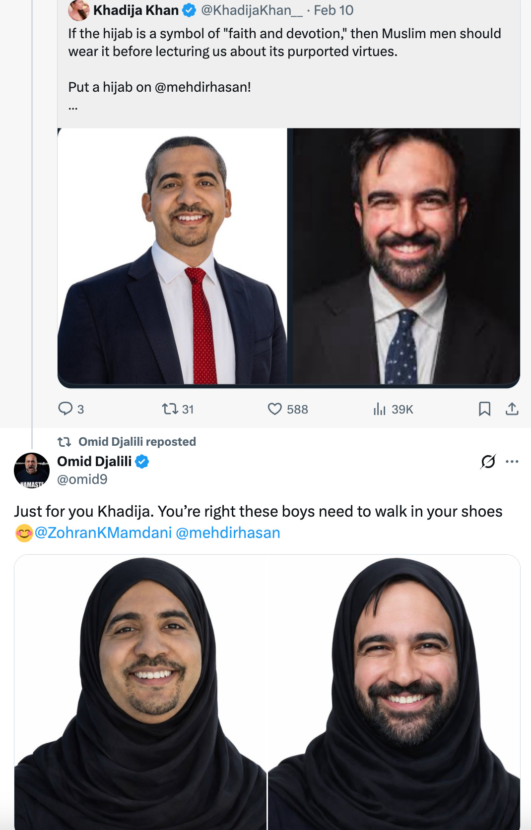 During this, Khadija Khan, who has long been a consistent voice opposing hijab, suggested that Muslim men who believe the hijab is such a positive thing should put their money where their mouth is and don one themselves. Djalili gladly complied.