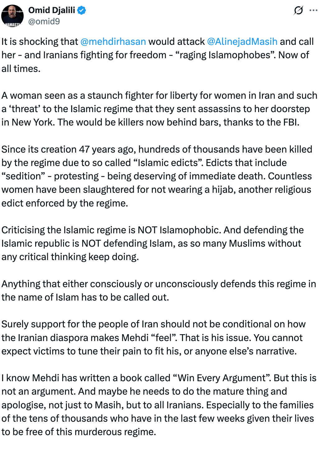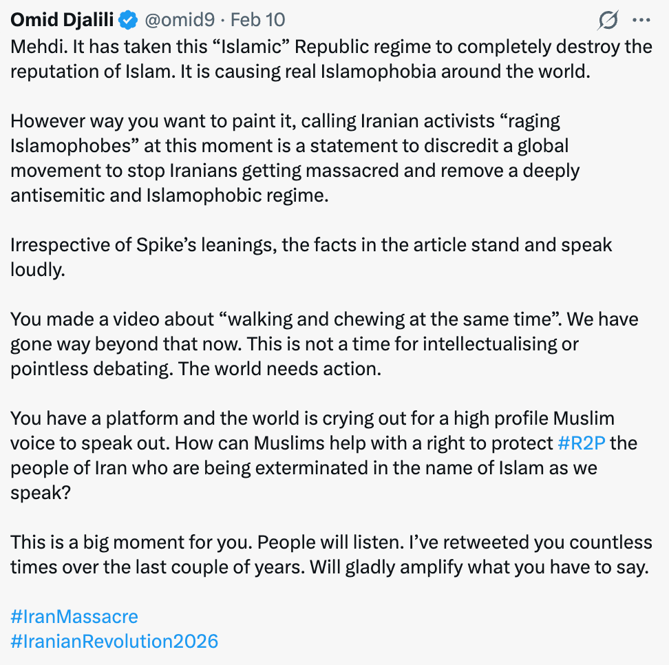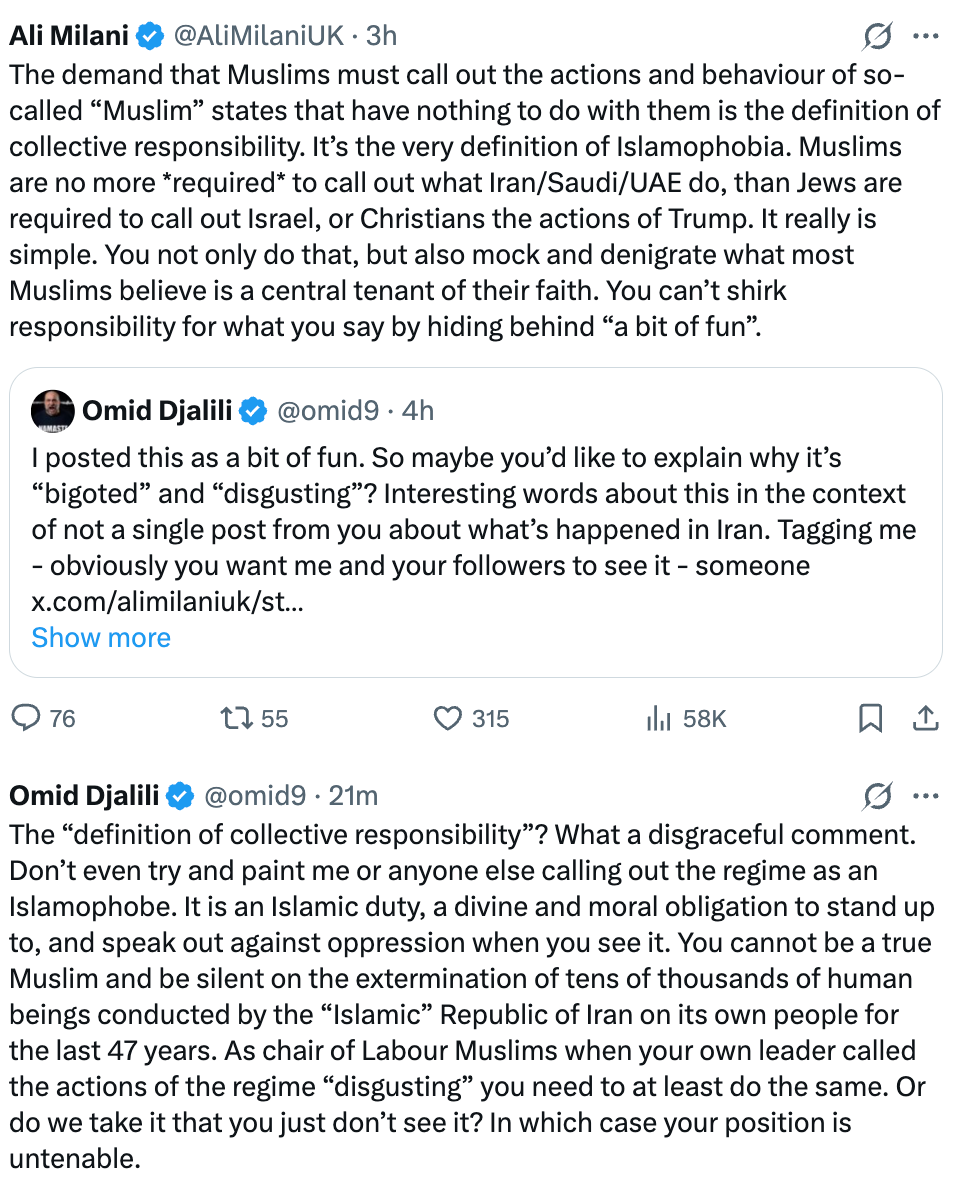 Milani is right that Muslims should not bear collective responsibility for Iran. I have consistently argued that we all need to be addressing illiberalism that arises within our own groups, mostly commonly addressing leftists and conservatives and urging them to criticise and marginalise the illiberal factions on their own sides, but I have also addressed this appeal to Muslims. However, nobody is obliged to be an advocate or defender of their ideological beliefs. They do have the right to just practice them privately and expect to be left alone. But these individuals do publicly position themselves as political advocates for Muslims and as progressive voices so they cannot reasonably expect to avoid scrutiny when they appear to endorse conservative interpretations or berate those resisting them.