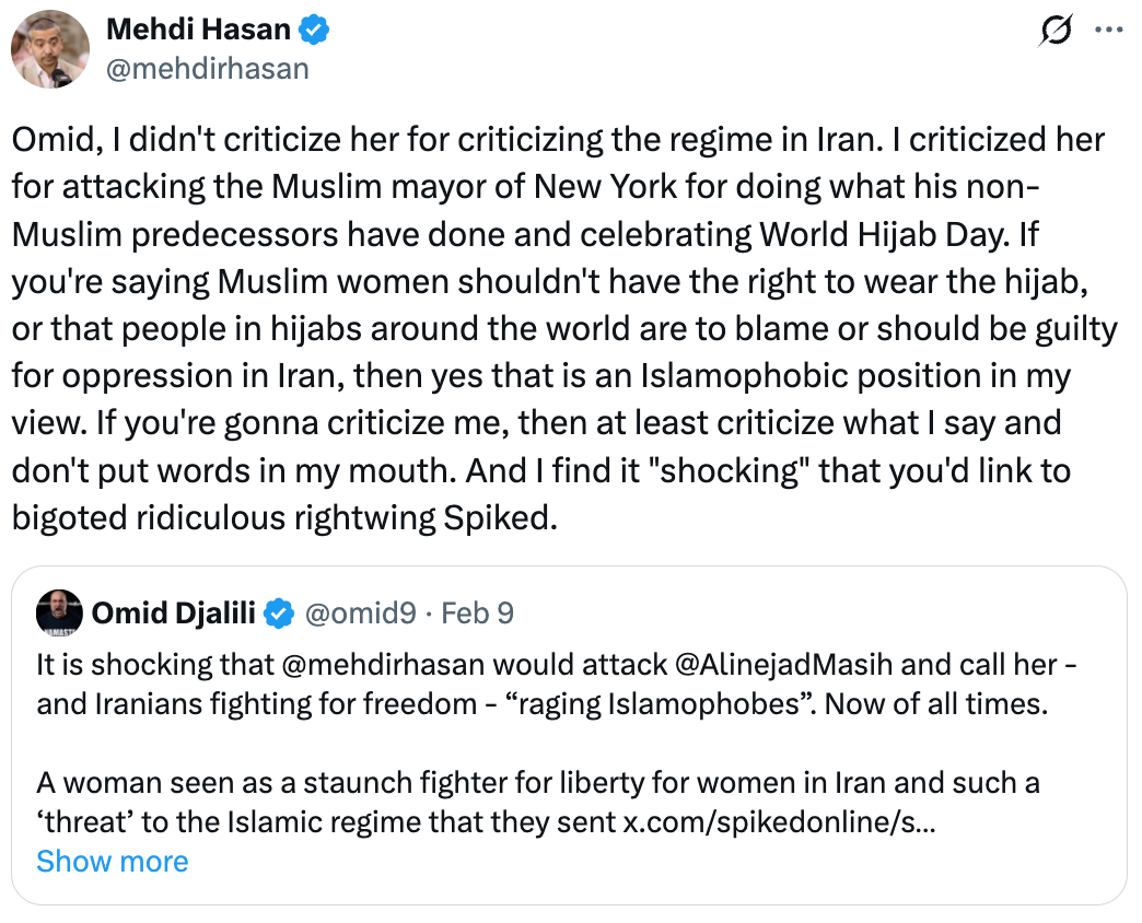 Mehdi Hasan responded by calling Alinejad a ‘raging Islamophobe.”