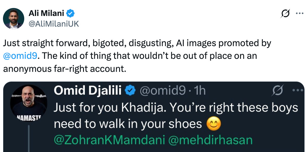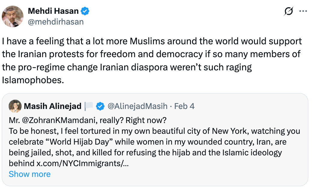 Zohran Mamdani did fail to live to up to this when he celebrated World Hijab Day. He had a choice to support conservative Muslims defending the hijab or progressive ones objecting to the values it represents; to indicate solidarity with Iranians protesting the Islamic regime which forces women to wear it or to entirely fail to do so. Masih Alinejad’s objection to his message was exactly what one would expect from a women’s rights campaigner of her calibre and he should respond to it and explain how his stance on hijabs and failure to address the Iranian massacre at all is compatible with his branding as a progressive. Mehdi Hasan’s kneejerk response to her in calling her a “raging Islamophobe” should undermine any credentials he still had as a progressive voice to be respected on human rights and social justice. Ali Milani should consider whether his leadership of Labour Muslims is really very welcoming to any Muslim women who are not, in fact, conservatives.