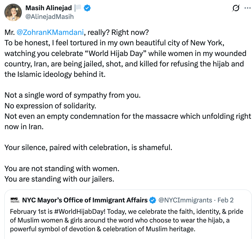 It began when the Mayor of New York City, Zohran Mamdani, put out an X post celebrating World Hijab Day. Iranian-American women’s rights activist Masih Alinejad, who has long opposed the Islamic regime and defended women’s right not to wear the hijab, objected.
