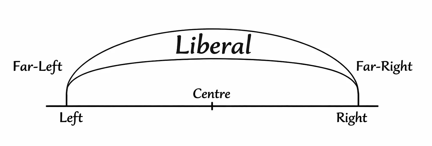 I see things a bit differently, however. I see liberalism less an axis different but equivalent to the left/right one and more as a higher-order value. This is because liberalism is the precondition for productive political disagreement. Because Western liberal democracies are founded on liberal principles as a governing system and (ideally) a set of well-established cultural norms and expectations, this provides the core basis for our kind of democratic societies that protect individual liberty and facilitate the free exchange of diverse viewpoints for the purposes of knowledge production and conflict resolution. It can be imagined as an umbrella that covers the majority of mainstream political thought as a default. Those extreme views on the fringes of either side which would curtail individual liberty, suppress viewpoint diversity and interfere with democratic processes and/or the constitutions of countries established to protect individual liberty and government by the consent of the governed are the views I have argued can coherently be considered extreme, radical or far. These are revolutionary or reactionary views which seek to dismantle the liberal, philosophical underpinnings of Western modernity and replace them with some Utopian vision of progress or a regression back to an imagined golden time of patriarchy, racial and religious homogeneity and persecution of sexual minorities.