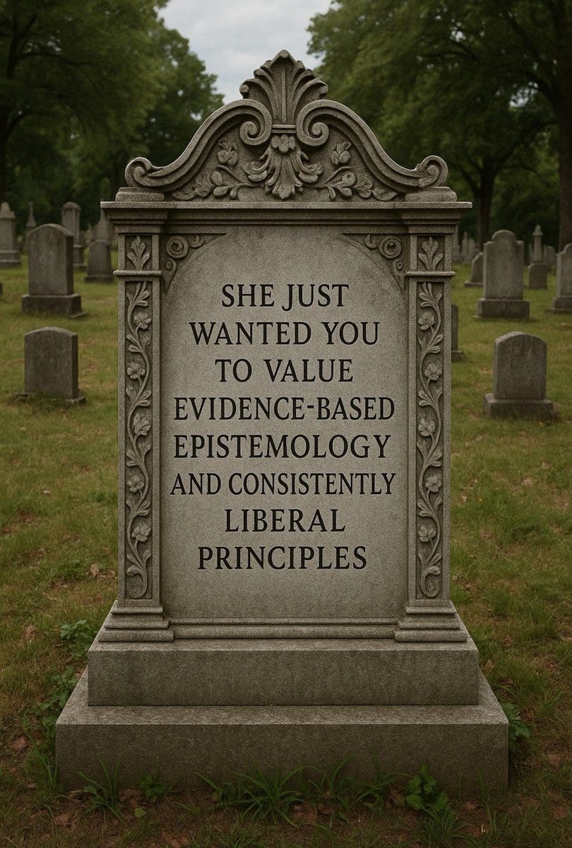 I have left instructions in my will for my gravestone to have an epitaph that reads “She just wanted you to value evidence-based epistemology and consistently liberal principles.”