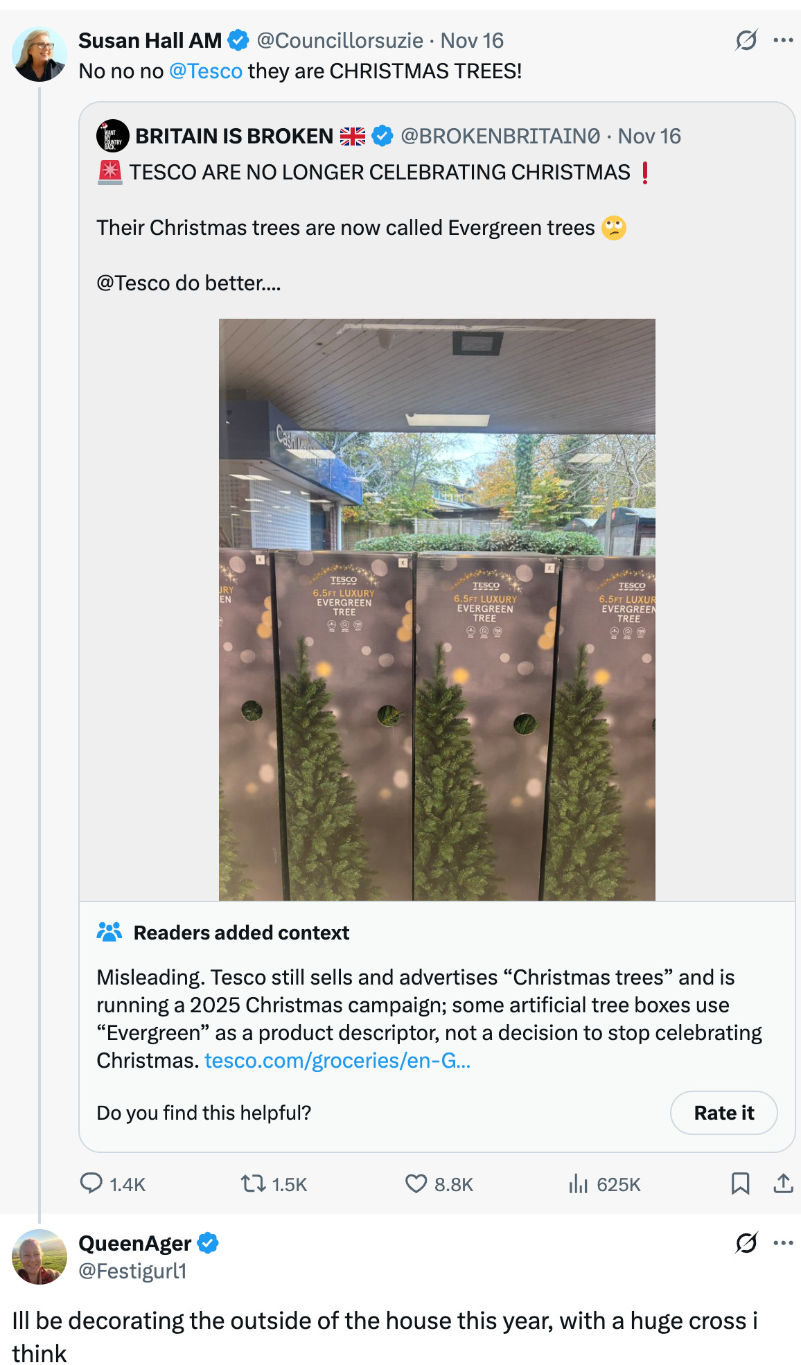 I have been informed repeatedly by people who have now mostly accepted that Tesco was just differentiating styles of Christmas tree rather than trying to erase Christmas, that this does not negate the reality people objecting to it were pointing at. There really has been a cultural shift towards “wokeness” and the prioritisation of the interests of minority groups alongside the demonisation of majority groups and dismissal of their interests, even if this particular incident was not actually an example of it. By criticising the response, I fail to understand what people are objecting to and why they interpreted it that way in the first place.