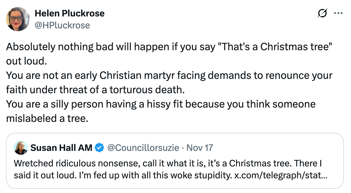 The UK has never had an American-style “War on Christmas” paranoia. We’ve mixed Christmas cards with Season’s Greetings, Yule logs with Advent calendars, secular parties with Christian services for at least the 51 years that I have been alive. It is, I would submit, important that we maintain this convention. Tesco calling one tree an “Evergreen” does not erase Christianity. It does not signal cultural collapse or capitulation to Islam or the woke. It is not disrespectful to Jesus, the culture, or the nation. Allowing people, including large supermarket chains, to choose their own language for whatever reason, is not anti-Christian. Demanding that everyone use Christian language or face boycotts and denunciations is anti-liberal. This degree of rageful problematising and paranoia about one tree perceived as mislabeled is alarming. A failure to recognise that it is irrational and illiberal and object to it sets a worrying precedent for our future tolerance of religious policing of public speech.
