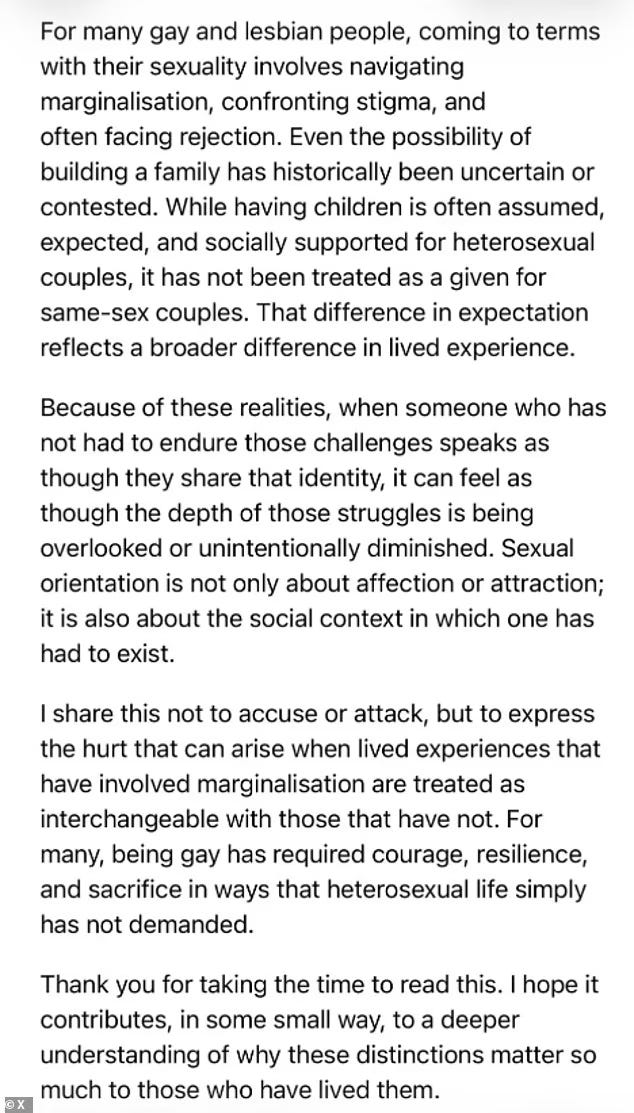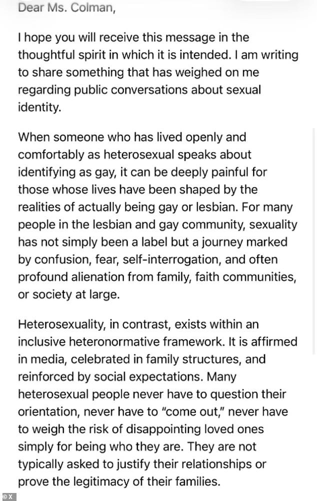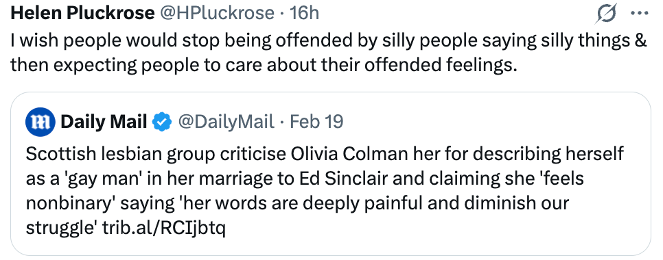 Consequently, I said that I “wish people would stop” grounding their objections in claims of deep psychological pain caused by silly or unserious statements. This does not mean those feelings are unreal or that people shouldn’t be sympathised with. It means that I think they are poor grounds on which to appeal to others. People can and have felt genuinely hurt or offended by all sorts of things — women entering the workforce, criticism of religion, or simply seeing gay and lesbian people live openly. Feelings of hurt are not authoritative in themselves. The same principle applies to those who treat their own disgust as moral authority. These reactions are subjective, and the power to decide which feelings count as morally binding will always sit with the dominant moral orthodoxy. It is far better to argue that something is materially harmful, factually false, or ethically wrong. This is why I think the most constructive response to Colman saying she feels like a gay man is simply to focus on the truth claim: “Well, you’re not a gay man and and it’s a silly thing to say.”
