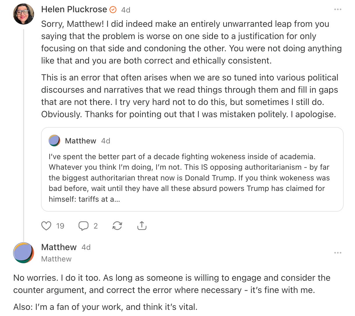 This kind of wrongdoing can also apply to institutions and political movements which appear to have gone off the rails, lost their mission and be in need of course correction. They can engage in ideological overreach overcorrecting for their opponents’ overreach, act in ways that go against their stated principles, make bad leadership choices, allow extremists to have too prominent a voice or veer into condoning authoritarianism. If allowed to continue along these lines, it will become defining of their character, but they have the option to recognise their failings, acknowledge and apologise for them and self-correct and we should retain hope and expectation that they will do so. In the case of political sides, we very much need liberal leftists and ethical conservatives to address the extremists on their own sides and marginalise them to the fringes so that the “character” of neither “the left” nor “the right” is defined by illiberal identitarians. With regards to the Trump statement, I would suggest that this kind of apology would be warranted. Denigrating the memory of fallen soldiers fighting for one’s country is certainly out of character for ethical conservatives.